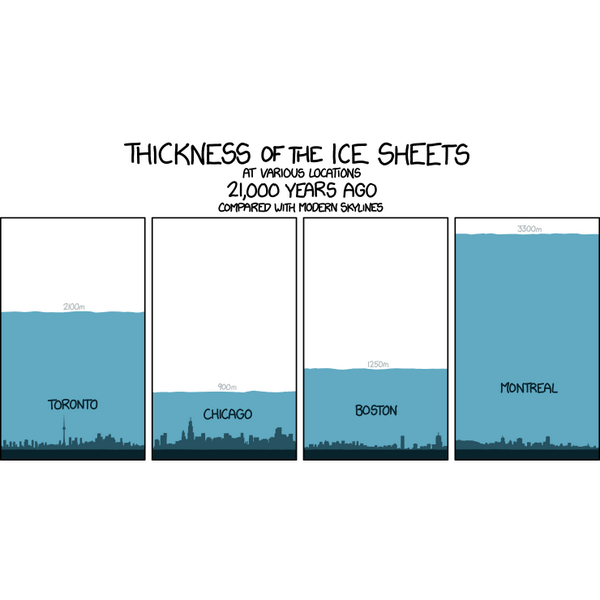 Thickness of the ice sheets at various locations 21,000 years ago compared with modern skylines.
