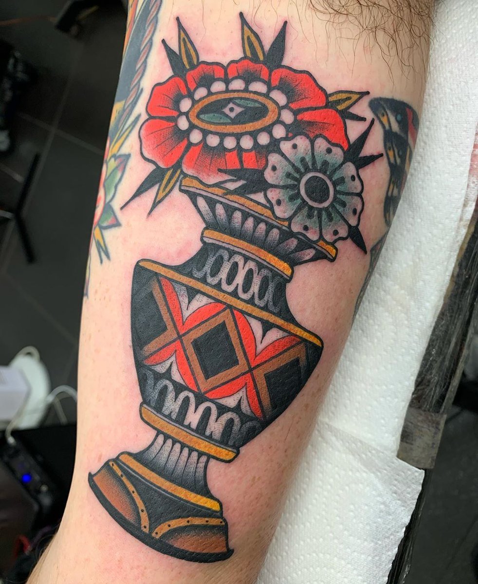 Flower vase tattoo by Myles - To see more work visit @Myles_veartattoo via instagram.