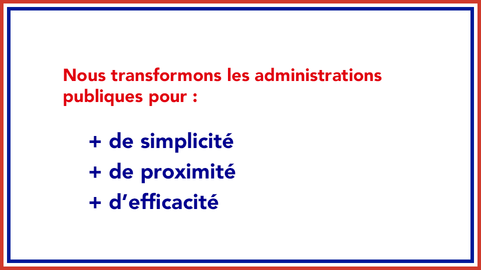 Pour plus de simplicité dans l’administration, l’État se transforme : - suppression de près de 90 commissions consultatives - suppression ou regroupement de 80 entités administratives - simplification des organigrammes