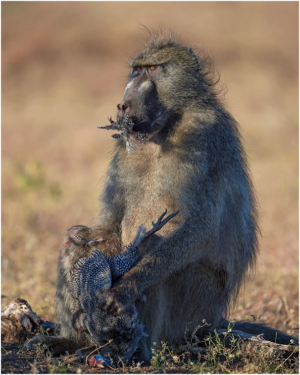 Baboon has seemingly killed a guinea fowl and consuming it out on the open plain.