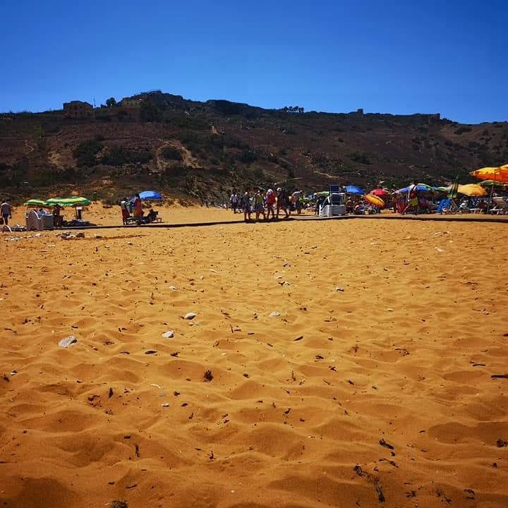 Golden sand beach with emerald green sea water and blue sky