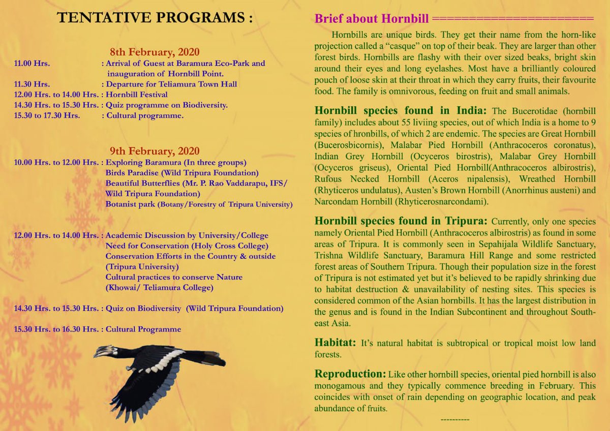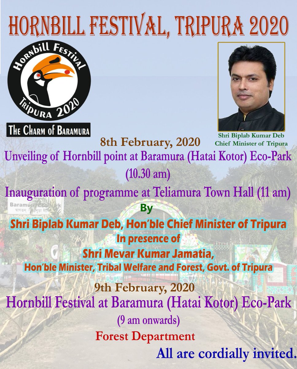 #Tripura on 8th & 9th February we are going to celebrate 'Hornbill Festival' at Hatai Kotor (Baramura)Eco Park by Tripura Forest Department. All are cordially invited to join in huge number & make this festival a successfull one.#TripuraTourismpic.twitter.com/1uCmyeTeKX -