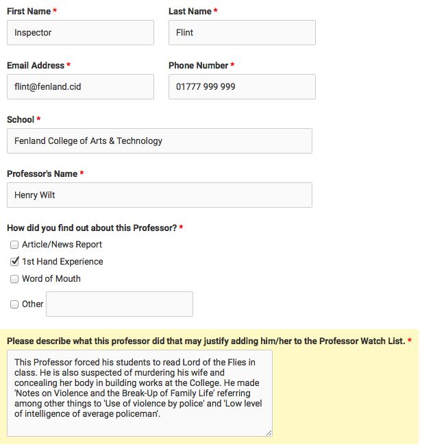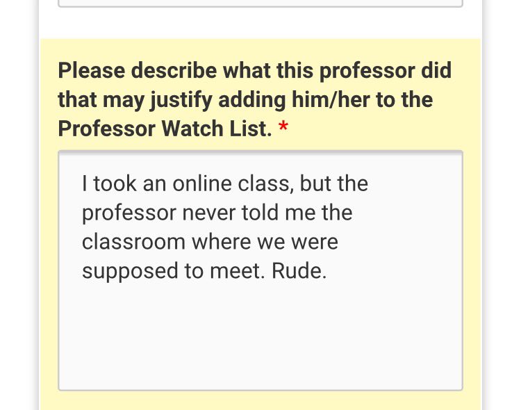 #trollprofwatchlist 1. go to http://professorwatchlist.org 2. enter totally valid complaint 3. screenshot, submit, tweet w hashtag 4. glory -