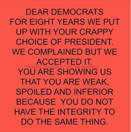 Democrats you are showing you're weak,spoiled,inferior and lack integrity ...but then we already knew that