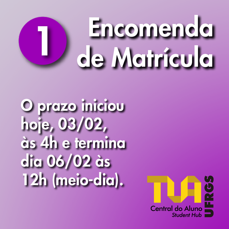 O prazo iniciou hoje, 03/02 e termina dia 06/02 às 12h. Nessa etapa os veteranos dos cursos de graduação solicitam disciplinas pelo Portal do Aluno. Confere todas as informações e dicas: http://bit.ly/2Omagmn (Facebook) http://bit.ly/2SdMcTJ (Instagram)