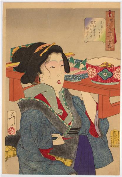 Yoshitoshi Tsukioka - Looking weighed-down - The appearance of a waitress at Fukagawa in the Tempo era