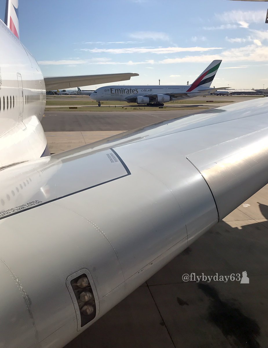 #A380 Power, Strength, Size, Consistency, Smartness... What do you expect? It's@Airbus#Cockpit at sunset,#RollsRoyce engines#Undercarriage And two better than one: BA at the front line, then Emirates taxiing in the background.