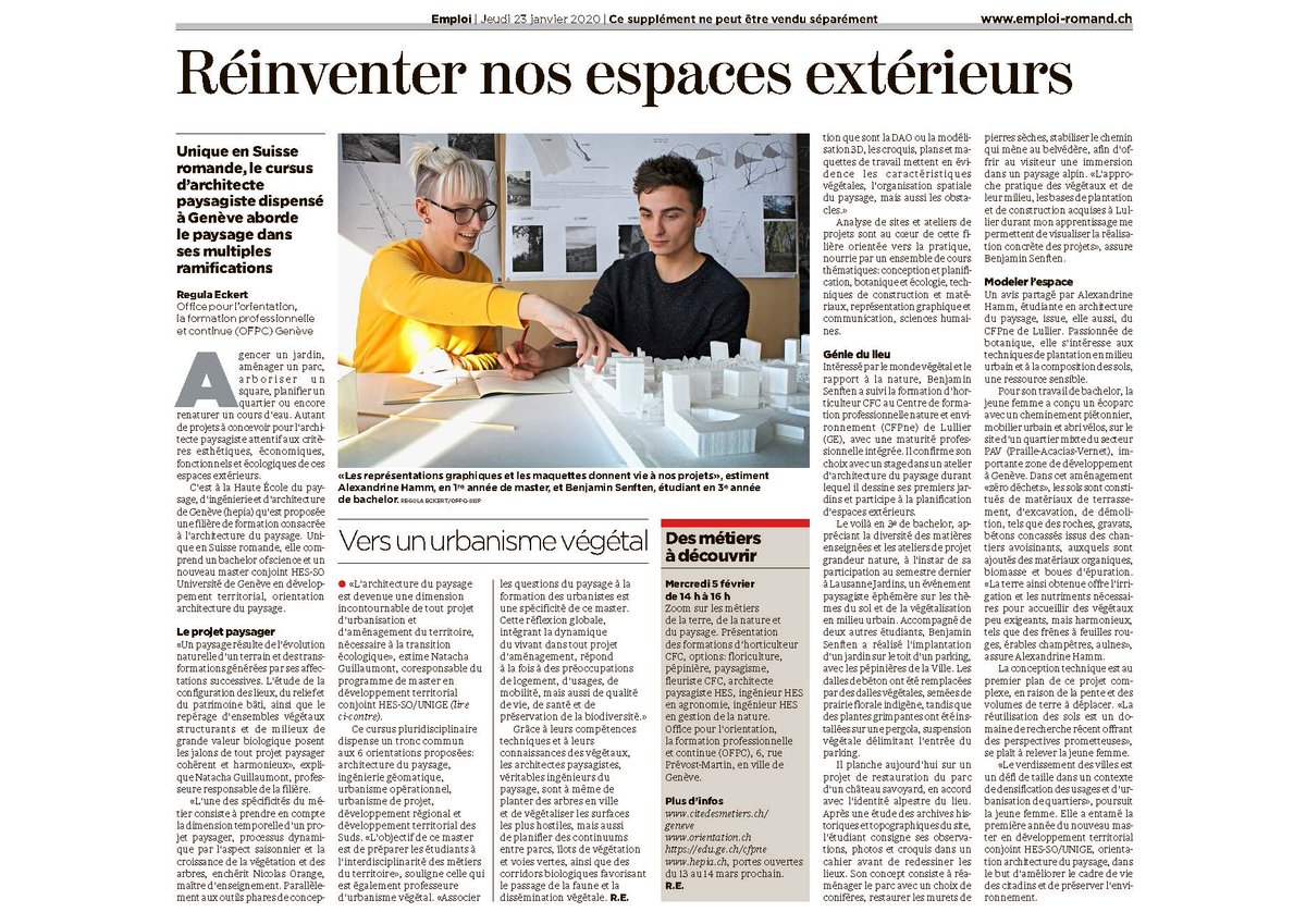 A lire sur le Cybermag de la Cité des Métiers - Genève. Article sur le Bachelor en Architecture du paysage dispensé à HEPIA Genève et le Master conjoint HES-SO-UNIGE en Développement terrritorial.