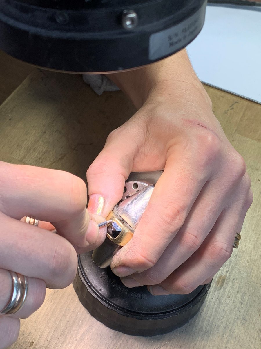It’s always fascinating watching Giles at work: here, he is setting a beautiful 3.92ct black diamond into 18ct yellow gold for a client commission.