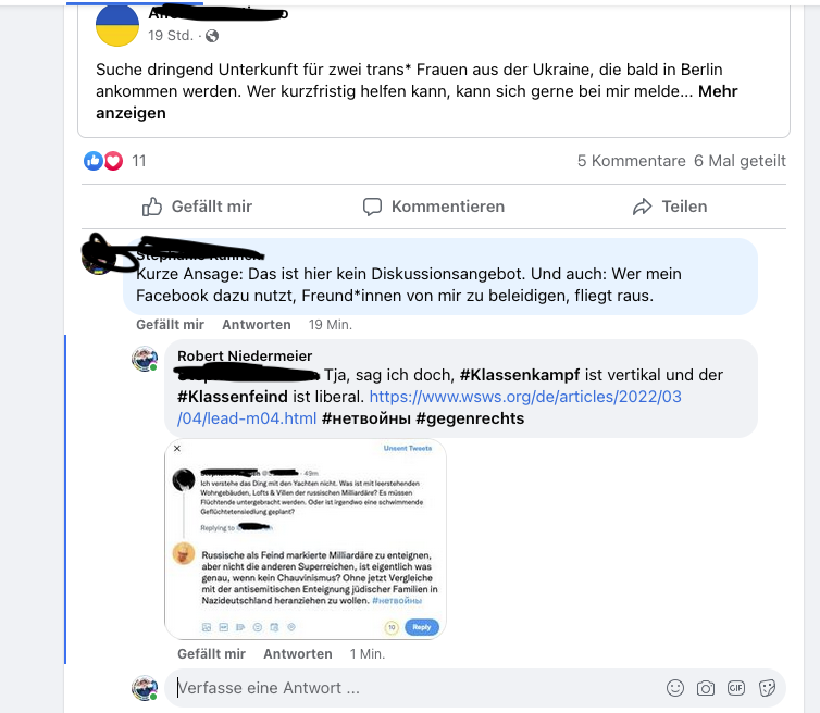 Man zeigt seine Solidarität mit der Ukraine übrigens nicht, indem man hier lebende Russ*innen ausgrenzt. Kinder, die hören müssen, dass sie “jetzt keiner mehr leiden kann“, Gäste, die in Kneipen und Läden „nicht willkommen“ sind, bringen keinen Frieden für die Ukraine.