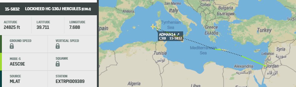 #USAF#SOCOM HC130J Combat King II, tracked out of Jordan, heading northwest over Mediterranean. 0928z. ADMAN14 155832 ADMAN13 145815pic.twitter.com/7IVhCAptrO