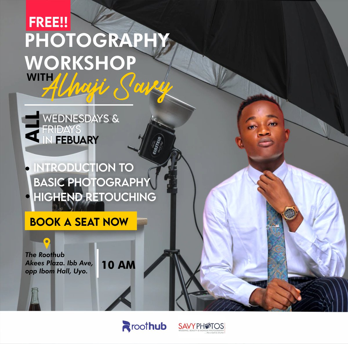 Great news guys!! A free photography workshop is here for you! Come and learn Intro. to basic photography and High-End photography. Grab this opportunity DATE: Every Wednesday and Friday TIME: 10:am VENUE: Roothub AKEES Plaza, IBB way.Opp Ibom Hall, Uyo