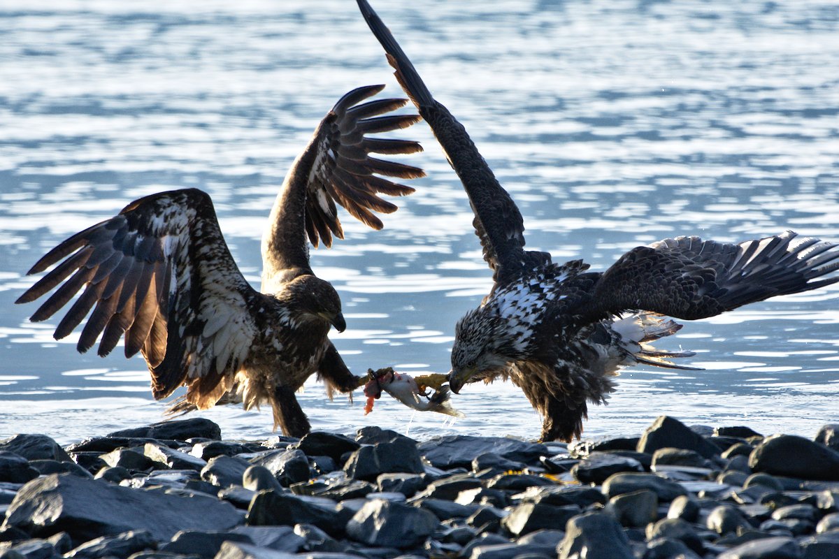 Two juvenile bald eagles fighting over a fish. Valdez, Alaska. https://photos.lwpetersen.com/Store/Alaska-Photos/Wildlife/ …