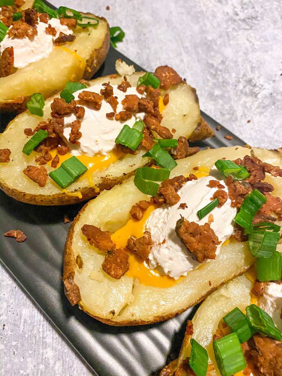 Vegan Beer Cheese Potato Skins just in time for the Super Bowl! Recipe via https://www.consciouslyvegan.info/2020/01/vegan-beer-cheese-potato-skins.html …