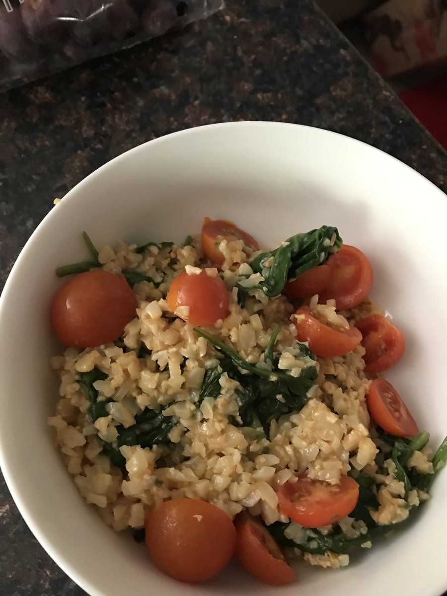 cheezy riced cauliflower w buffalo sauce, two types of vegan cheese, garlic salt, spinach & tomatoes