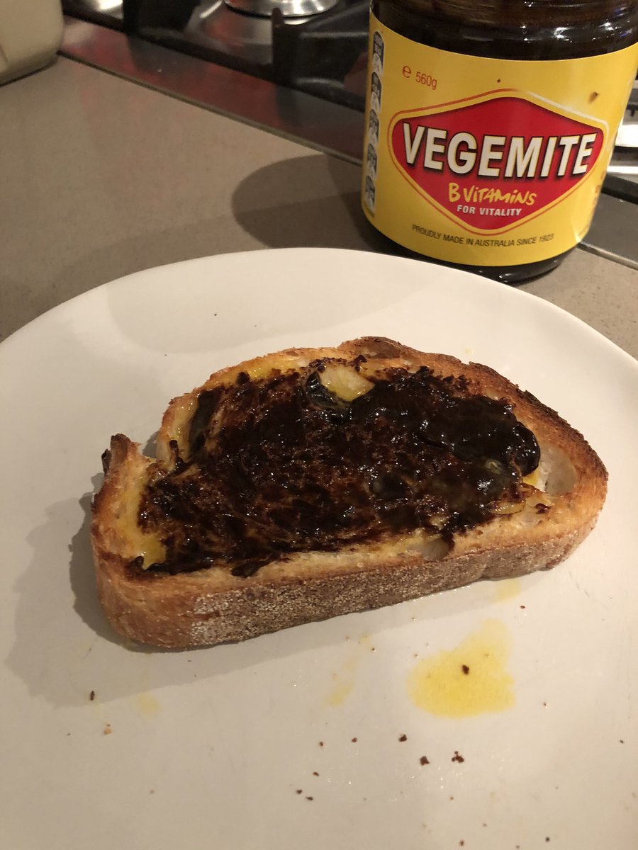 #Vegemite when she couldn’t either afford or get a jar of@marmite - it was okay. Tasted alright, but not quite right, was nearly the right texture, but couldn’t help the tinge of disappointment in it not being Marmite.#MarmiteWars -