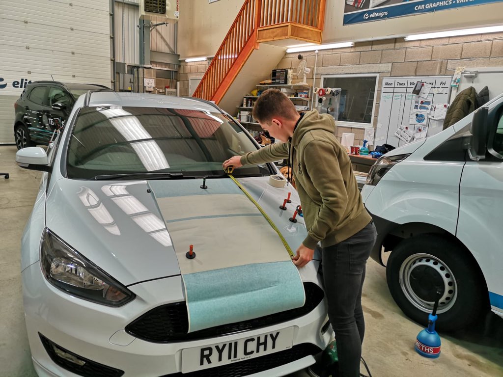 @workexperience from@yggllangynwyd & here he is learning about our#vehiclebranding by measuring up#graphics for a#TeamSky@bridgendford#FordFocus &#FordEcosport, under the watchful eye of our#vehiclegraphics#teampic.twitter.com/oh2p5djiWa