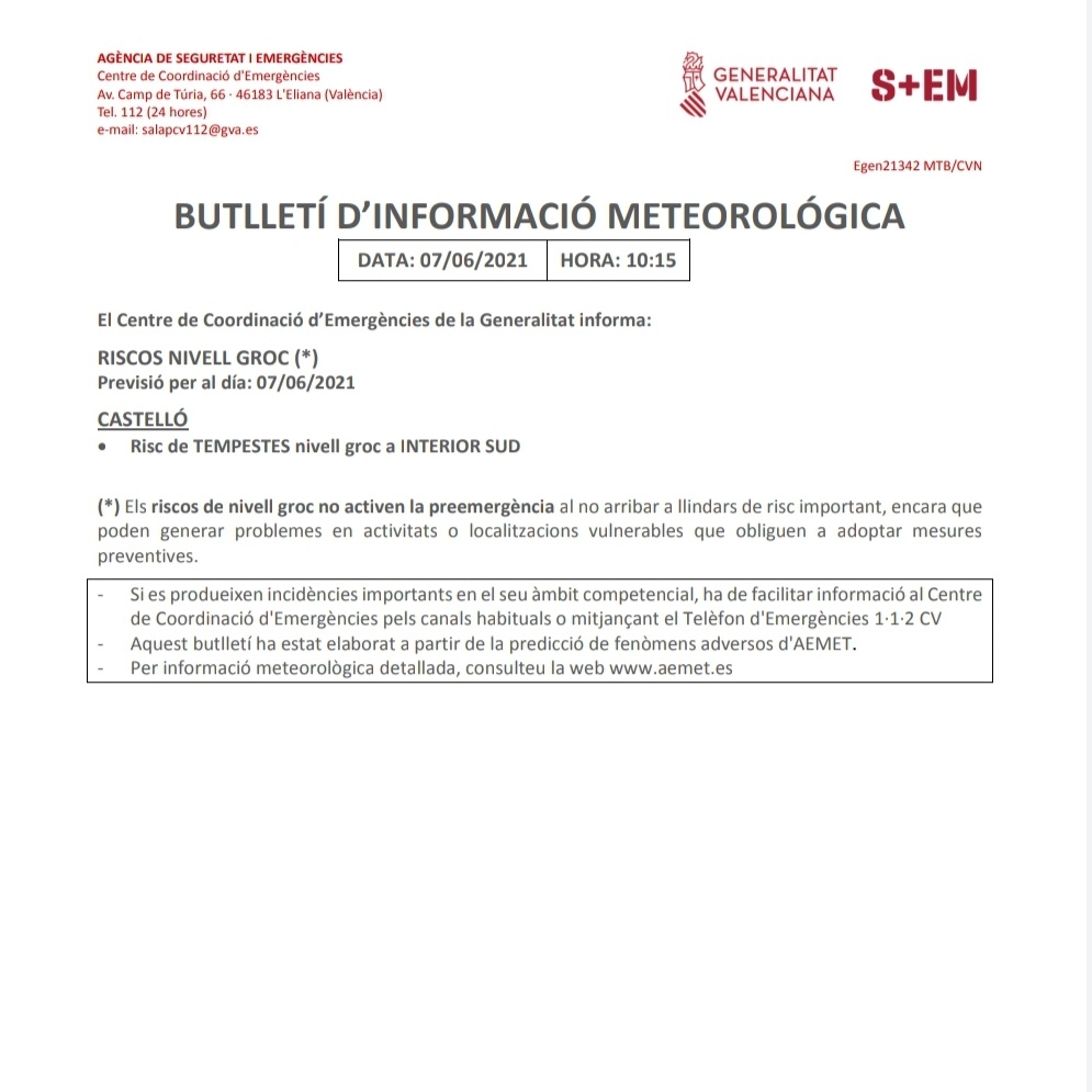 El Centre de Coordinació d'Emergències de la @generalitat difundeix avís davant la informació d'@AEMET_CValencia.