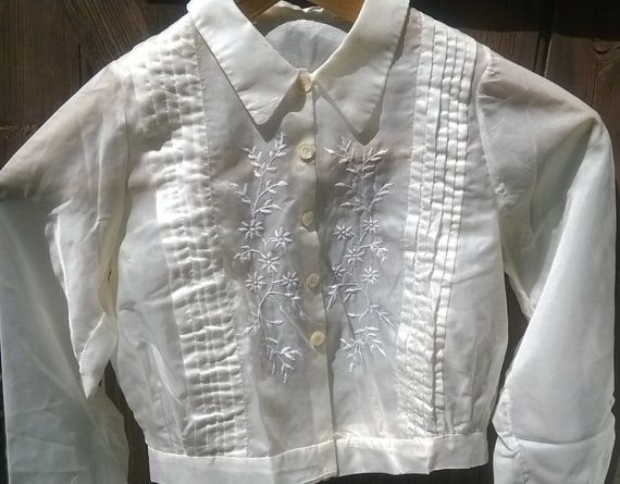 Short 1950's Nylon Blouse Handmade Cream Pleated Shirt Hand Embroidered Long Sleeve Size Small