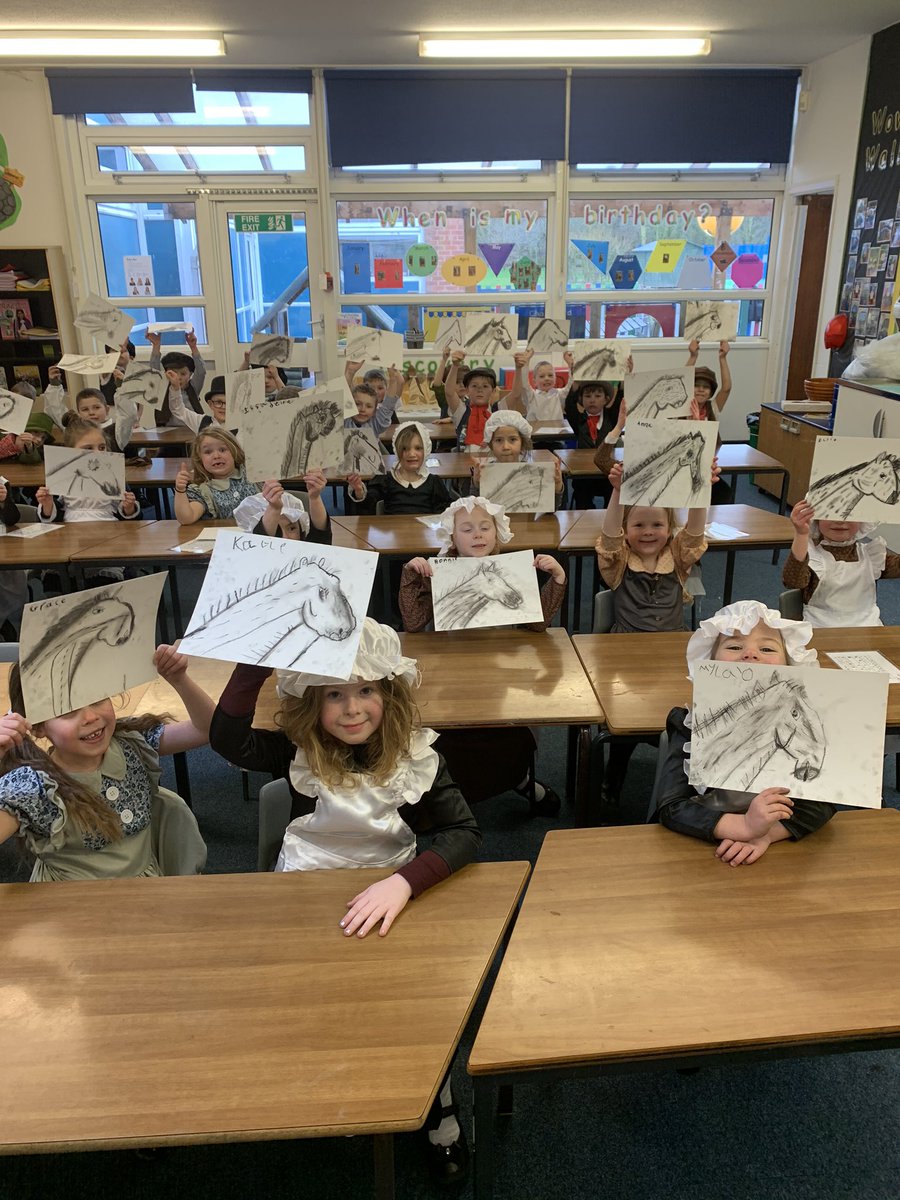 We ended the day with some art. We used charcoal to draw and shade in our horse pictures. Horses were used for transport as cars were less common.