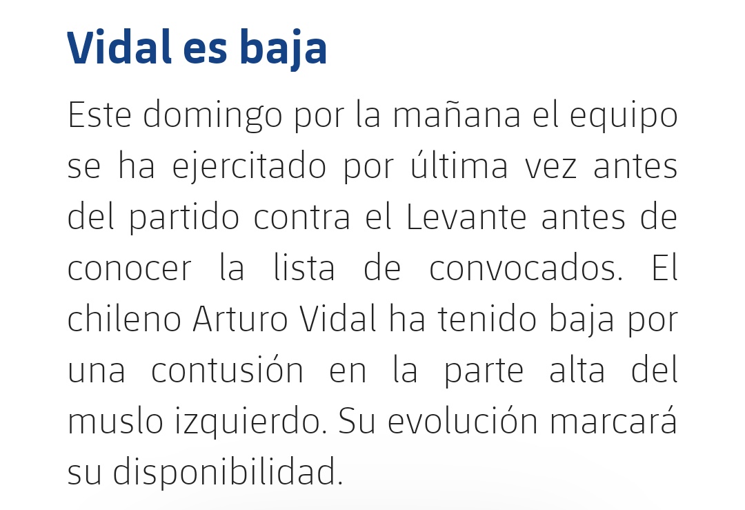 Arturo #Vidal souffre d’une contusion dans la partie haute de la cuisse droite et il est forfait pour la réception de Levante.