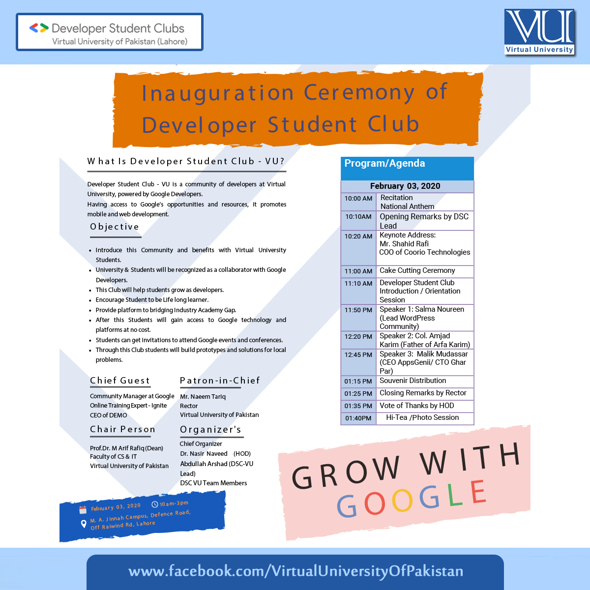 VUP is pleased to announce that Google Developer Student Club, Department of CS & IT VUP Chapter is organizing a one-day Mega Event on “Grow With Google” on 3rd Feburary, 2020 at Head Office, VUP, Lahore.