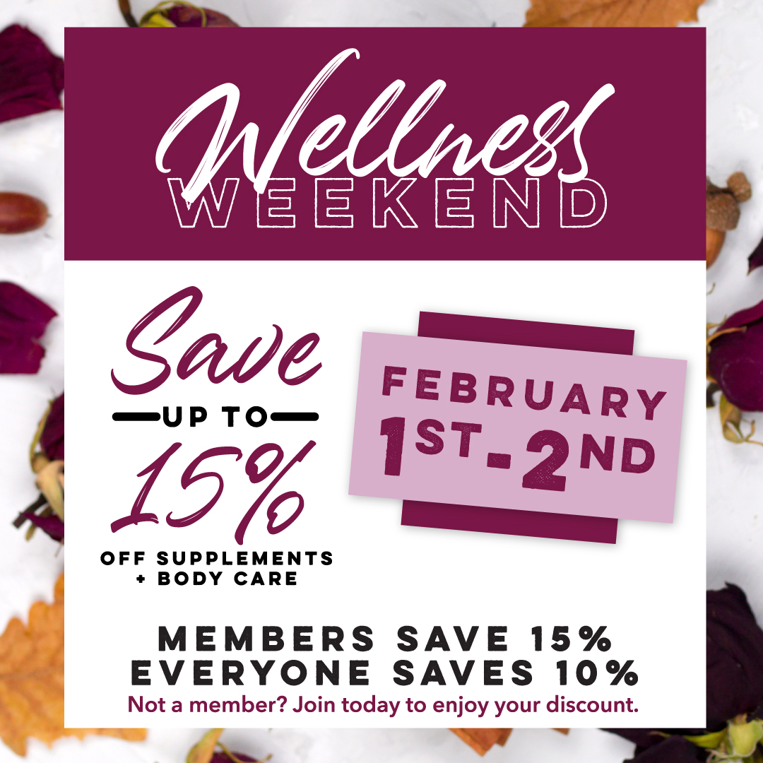 This weekend is wellness weekend! Members save 15% and non members save 10% on body care and supplements!