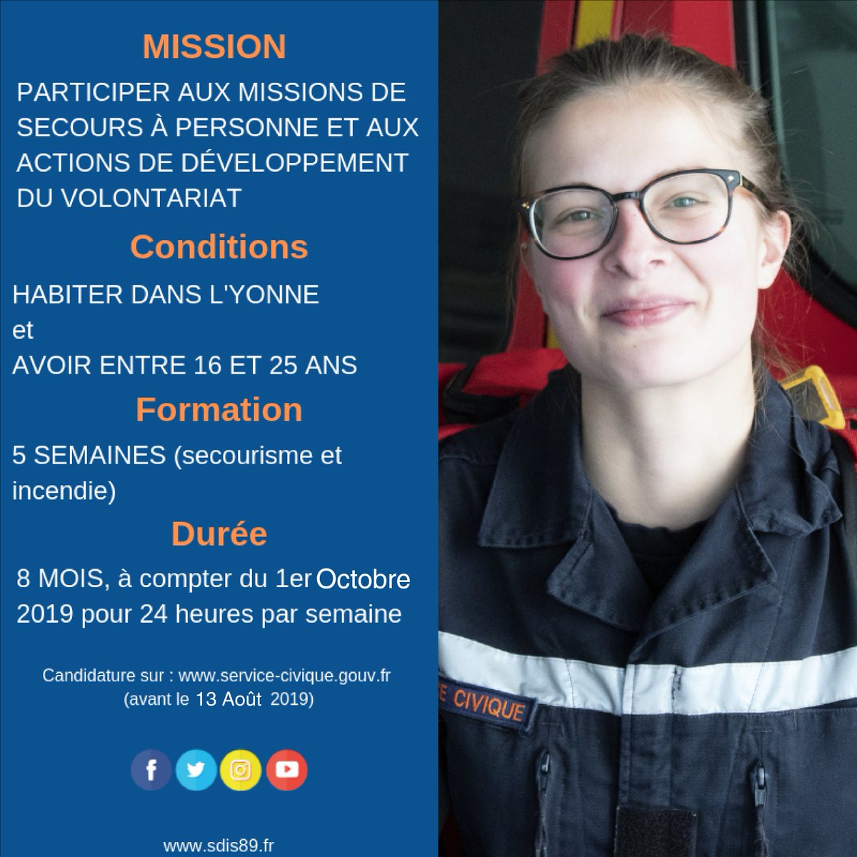 @SDIS_89 recrute 10#Volontaires du#ServiceCivique pour participer aux#Missions de#Secours à personne et aux#Actions de développement du#Volontariat Début de la mission le 01/10 pour 8 mois, 24h/semaine Candidature jusqu'au 13/08 en cliquant ici