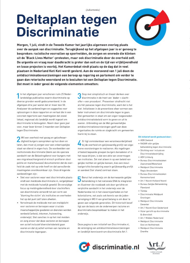 Een beroep van #Antidiscriminatievoorzieningen in Nederland op#regering en#parlement om tot een#Deltaplan