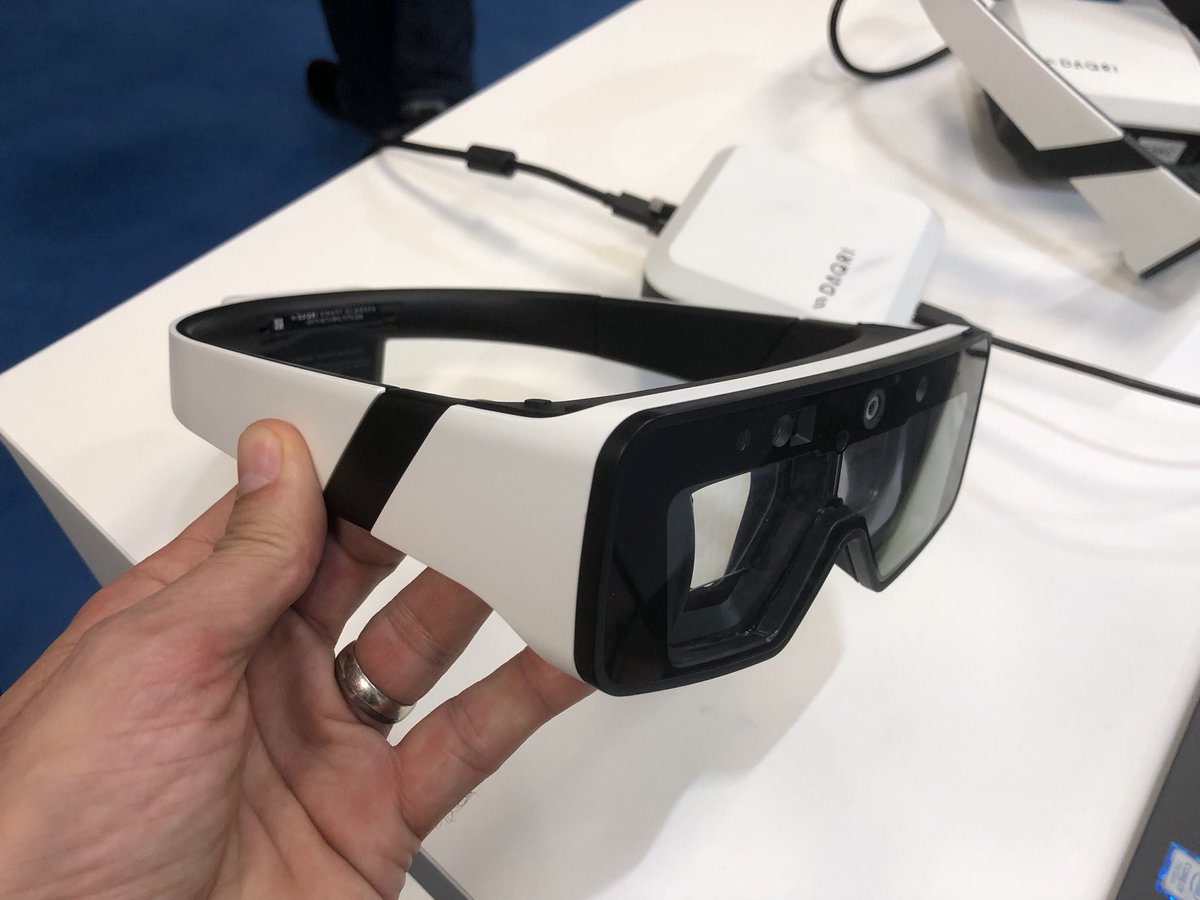 @DAQRI Smart Glasses brings a completely different experience and it is a major improvement from their Smart Helmet. Weights only 330g, battery lasts about 4 hours, 44o diagonal FOV, costs $5,000#VRWorld pic.twitter.com/jTFPsypJEc