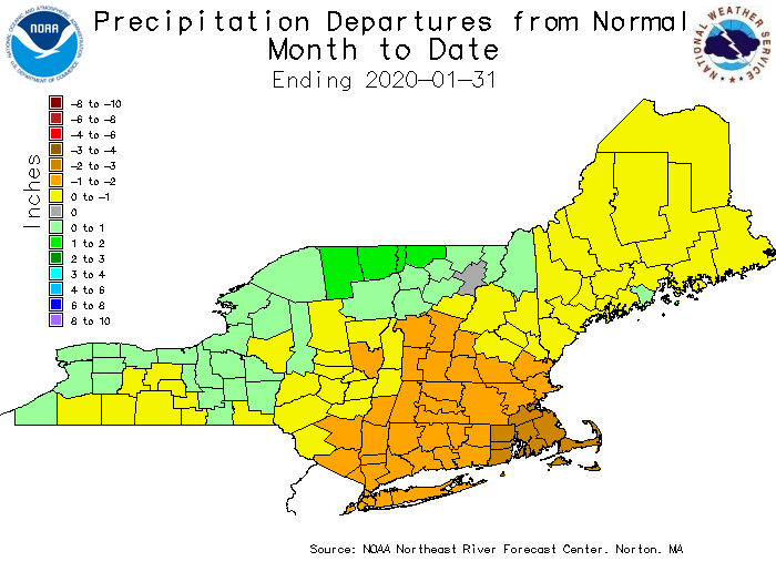 Temps were above normal in Jan 2020 across eastern NY and western New England, but precipitation was below normal in many locations. Precipitation amounts were generally 1.5-3.00" which were 1-2" below normal in many locations.