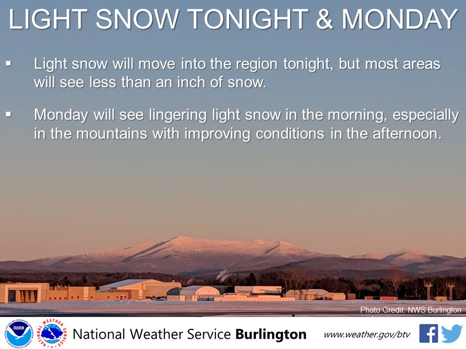 We've got some light snow moving into the North Country tonight and Monday, but no impacts are expected.