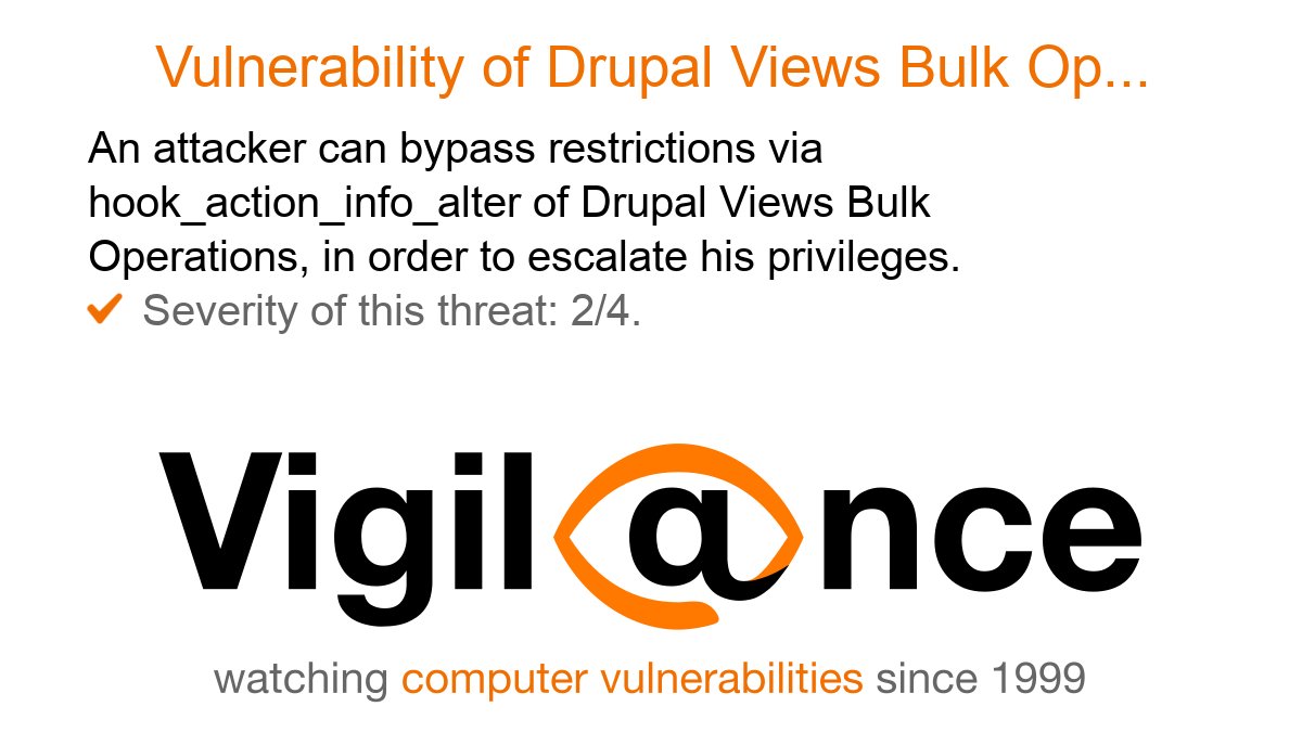 #Vulnerability of Drupal Views Bulk Operations: privilege escalation via hook_action_info_alter. https://vigilance.fr/vulnerability/Drupal-Views-Bulk-Operations-privilege-escalation-via-hook-action-info-alter-31532 ….#patchpic.twitter.com/I8Zz1r6vaG