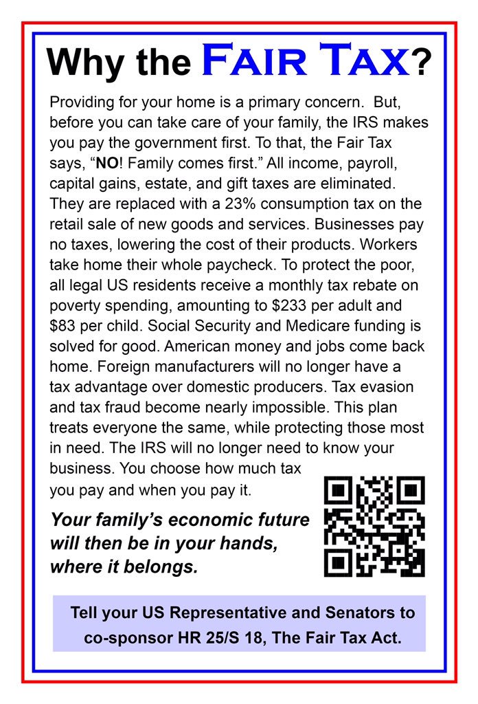 #FAIRtax Act (HR 25), that frees small businesses and the working poor from taxes.#WalkTheTalk pic.twitter.com/0RAVoLjqv2