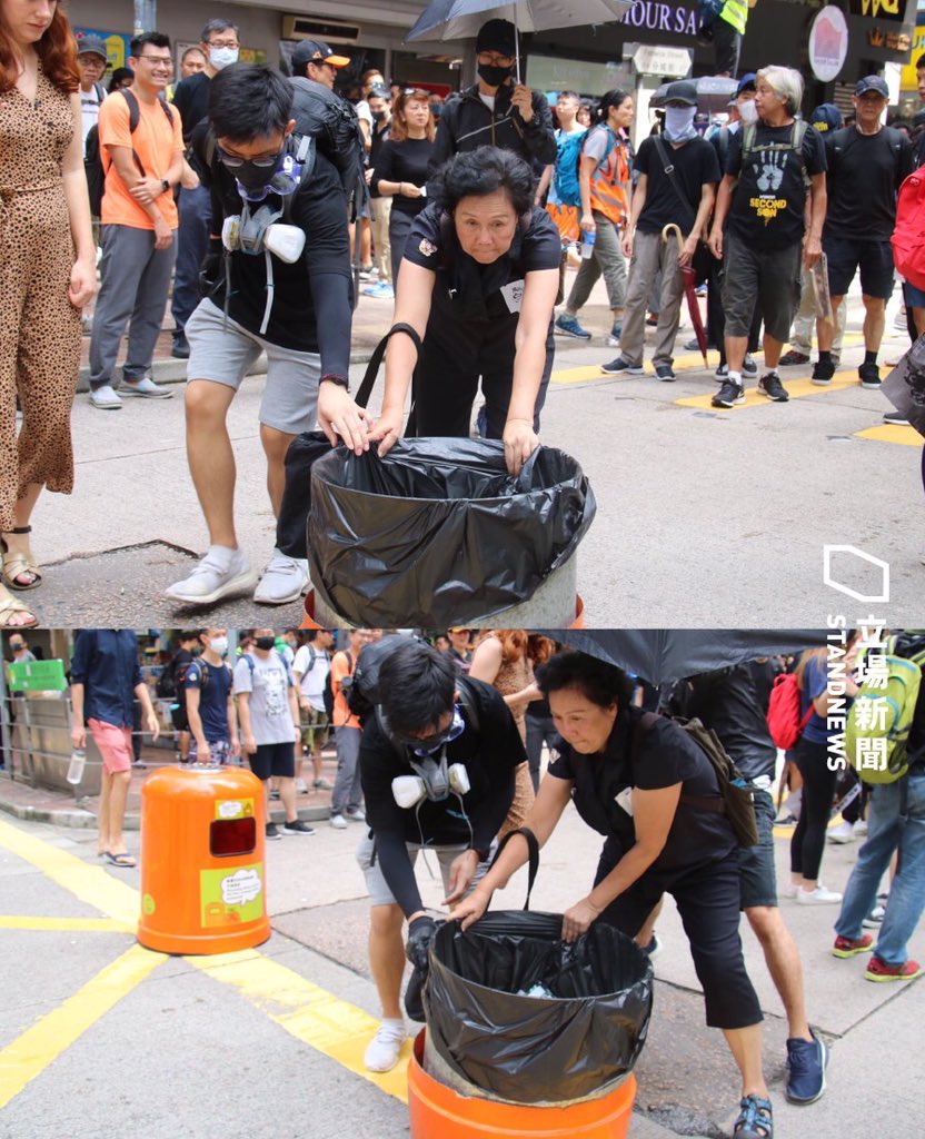 #hongkong moments captured by@StandNewsHK. Photo shows a lady making roadblocks w/ rubbish bin outside Chinese Methodist Church,#WanChai. When asked why she didn’t wear a mask, she said as an old lady she isn’t afraid & wants to protect the young#antielabpic.twitter.com/nNKgIieX7V