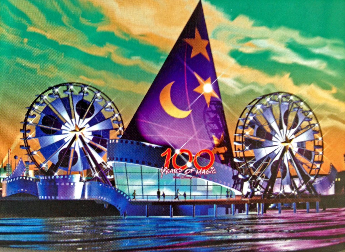 The Sorcerer Hat was the icon to celebrate Walt Disney’s 100th birthday & providing a icon for Disney MGM = to Spaceship Earth and the MK castle. The art proposes the hat on the lake & the 2 ears as Ferris wheels. Standard wheels wouldn’t provide enough ride capacity.