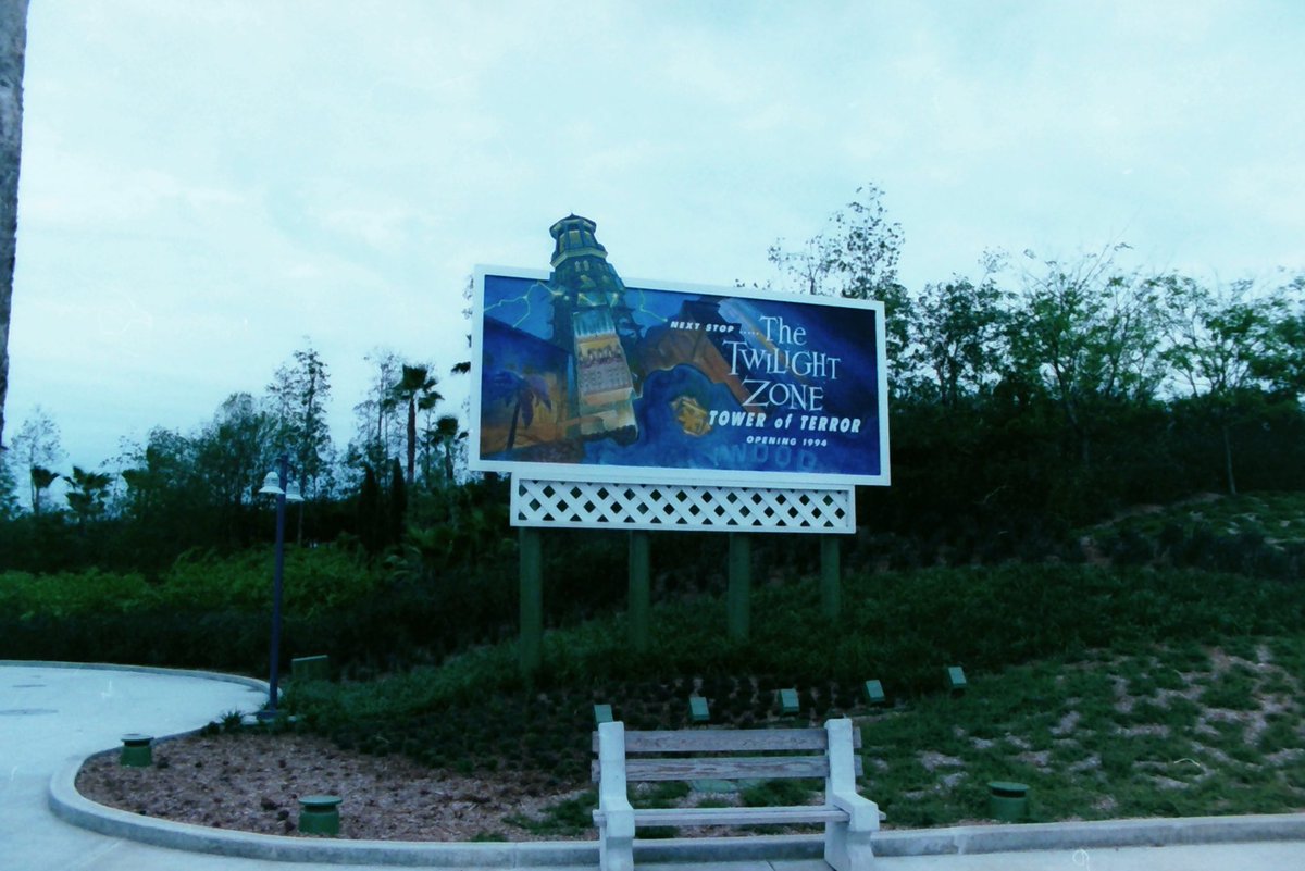 Billboards such as this one were built at the ticketing area of Disney MGM Studios to market the next attraction. This image documents the coming Tower of Terror ride.
