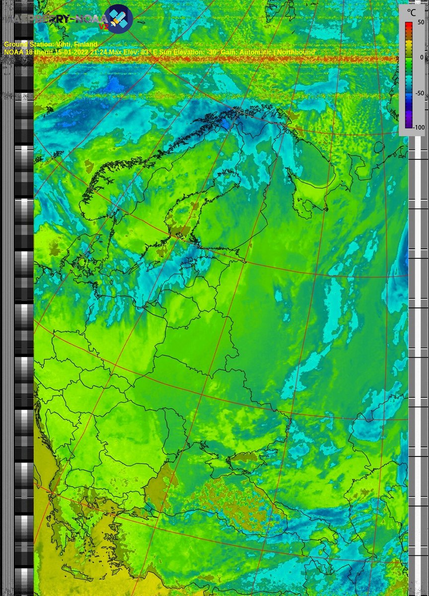 Ground Station: Vihti, Finland NOAA 18 15-01-2022 21:07 Max Elev: 83° E Sun Elevation: -30° Gain: Automatic | Northbound