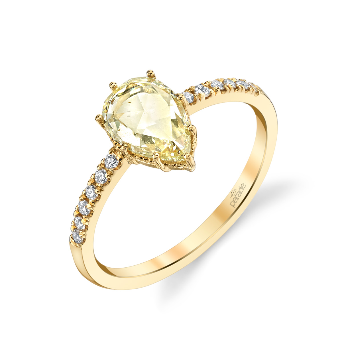 A rose-cut fancy yellow diamond sits atop a band of brilliant white diamonds in this stunning ring from the Lumiere Bridal Collection by