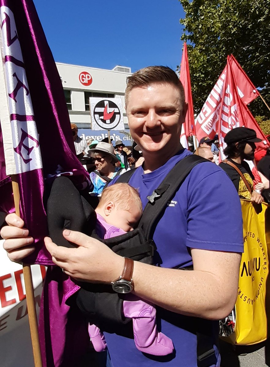 Conor's first rally today - photo just before we found some shade. Standing up for refugee rights in CBR.