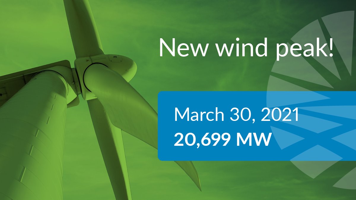#wind peak of 20,699 MW on March 30, 2021. This surpasses the previous peak by 351 MW set on February 5, 2021. pic.twitter.com/3uYGkj8lqH