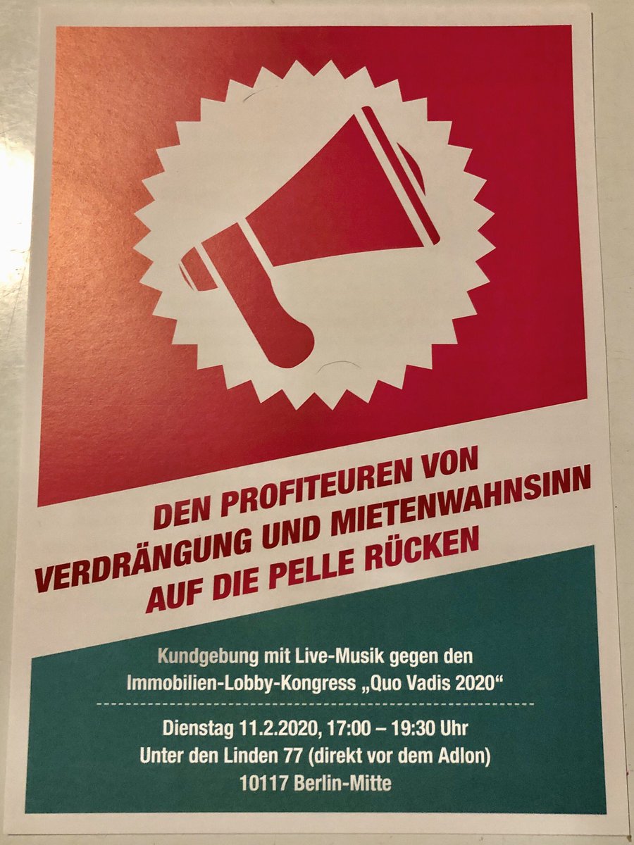 #Verdrängung &#Mietenwahnsinn auf die Pelle rücken#Kundgebung mit Live-Musik gegen den#Immobilien-#Lobby-#Kongress „#QuoVadis2020“ 11.02.2020#b1102 17:00 – 19:30 Unter den Linden 77 (direkt vorm#Adlon) 10117#Berlin-#Mitte#KeinHausWeniger#WirSindMehr pic.twitter.com/jpYDBE791f