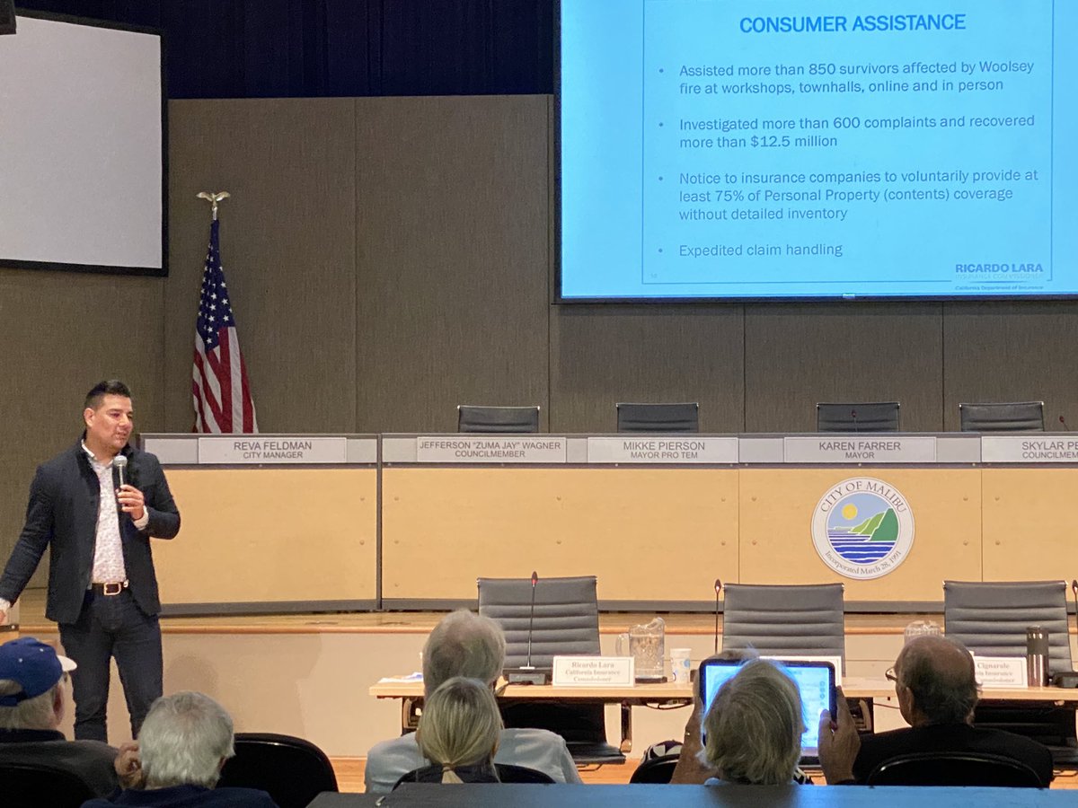 @ICRicardoLara speaking with Malibu homeowners about recovering from#wildfires and sharing information to help with#insurance claims issues from the#woolseyfire. pic.twitter.com/p7j9VD4cYG