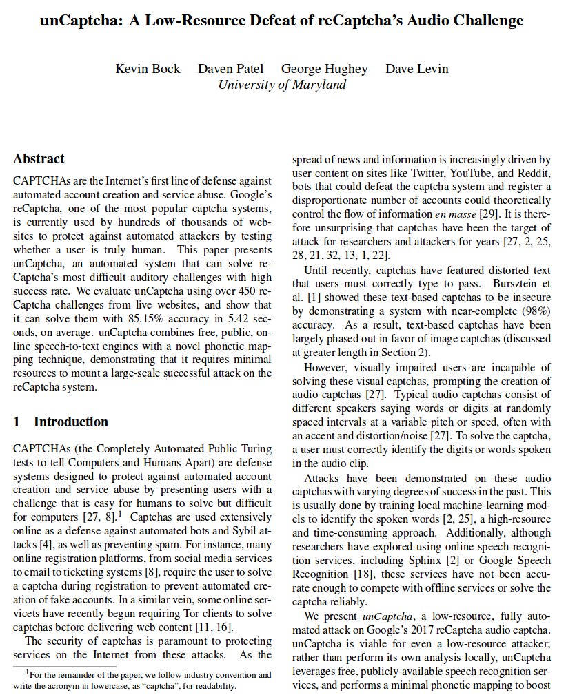 unCaptcha: A Low-resource Defeat of reCaptcha's Audio Challenge http://uncaptcha.cs.umd.edu/papers/uncaptcha_woot17.pdf …