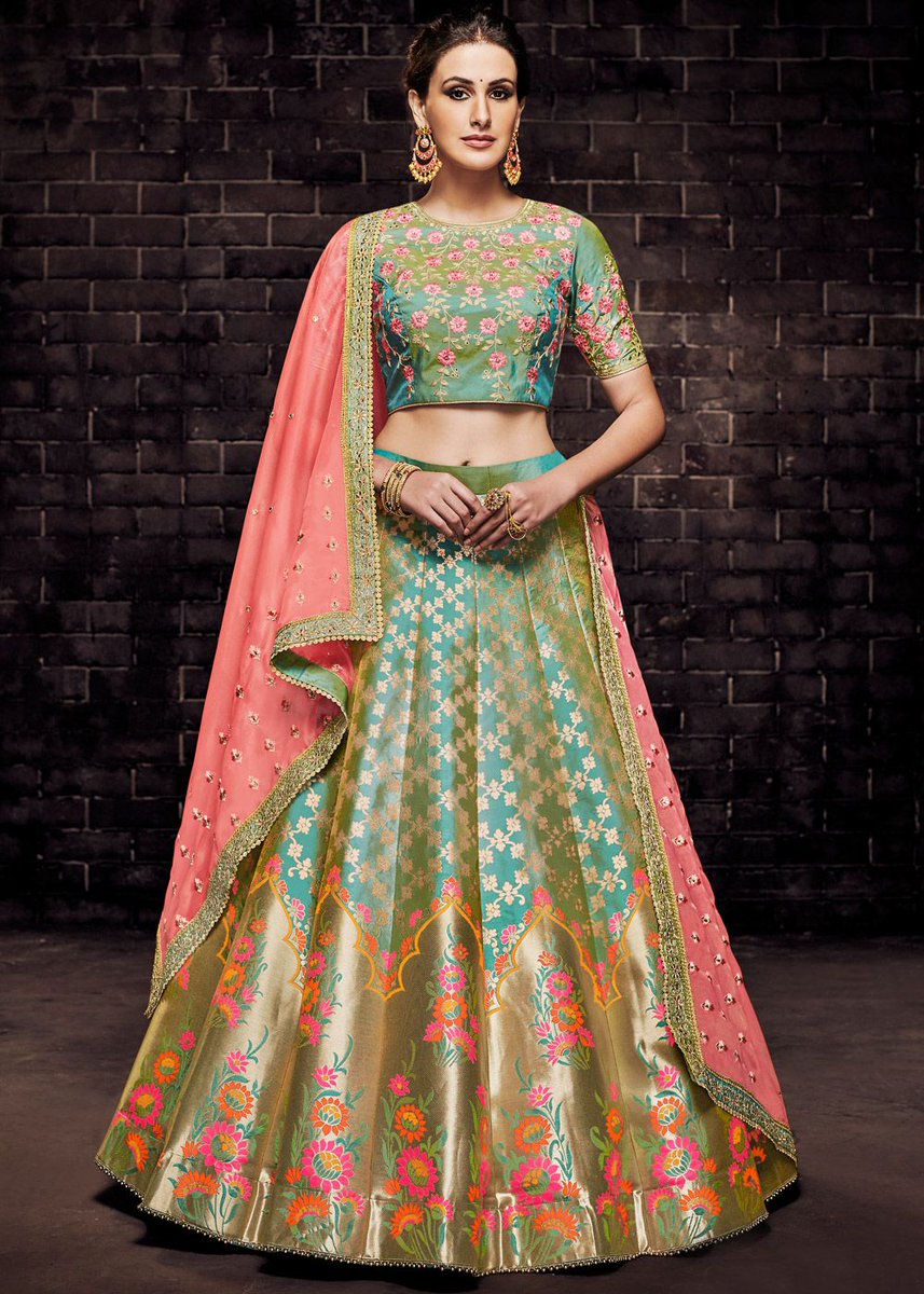 Make everyone speechless when you step out in this turquoise woven lehenga choli with contrast color dupatta. Shop Now: http://bit.ly/2R6pkrw