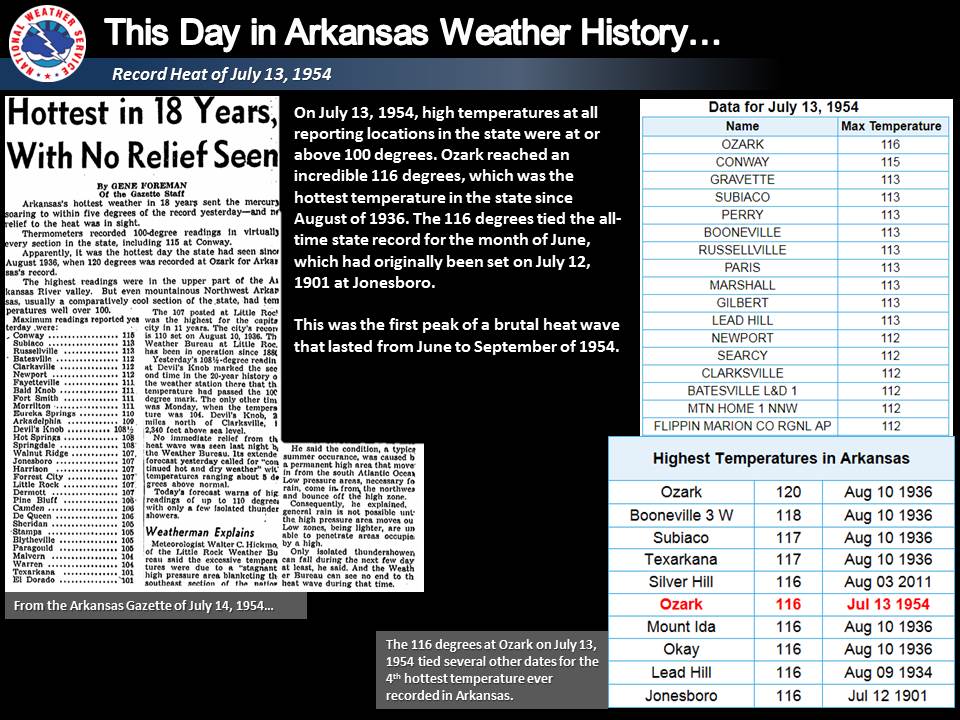 On this day in 1954, highs were at or above 100 across all of Arkansas. Ozark reached 116, which tied the all-time state record for June (originally set at Jonesboro 7/12/1901). This was the first peak of a brutal heat wave that lasted until September of 1954.