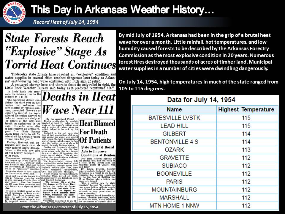 On this day in 1954, highs in much of Arkansas ranged from 105 to 115 degrees. Numerous forest fires destroyed thousands of acres of timber land. Municipal water supplies in a number of cities were dwindling dangerously.