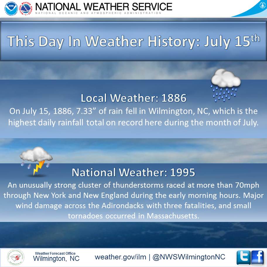 July 15th has definitely had a wet history. For us, there is no rain in our forecast for today. Just sunny and high around 90.