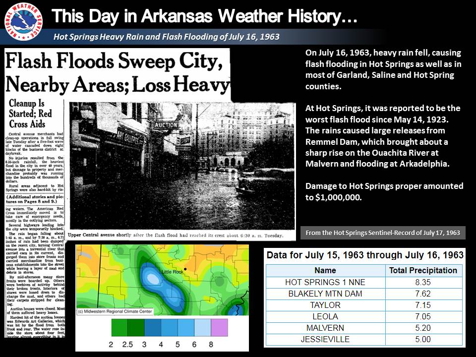 On this day in 1963, heavy rain fell, causing flash flooding in Hot Springs, as well as most of Garland, Saline, and Hot Spring counties. At Hot Springs, it was reported to be the worst flash flood since May 14, 1923.