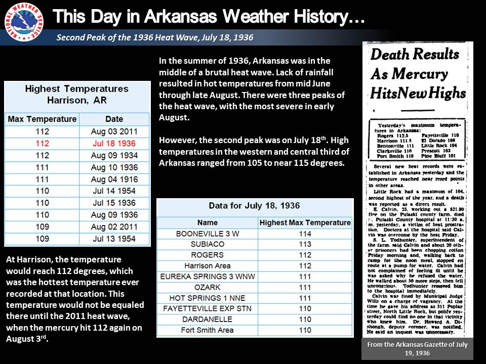 On this day in 1936, high temperatures in the western and central 1/3 of Arkansas ranged from 105-115. One person died due to heat stroke. Harrison recorded a record high for July. This also tied the city's all-time record of 112 set in 1934 (tied again in 2011).